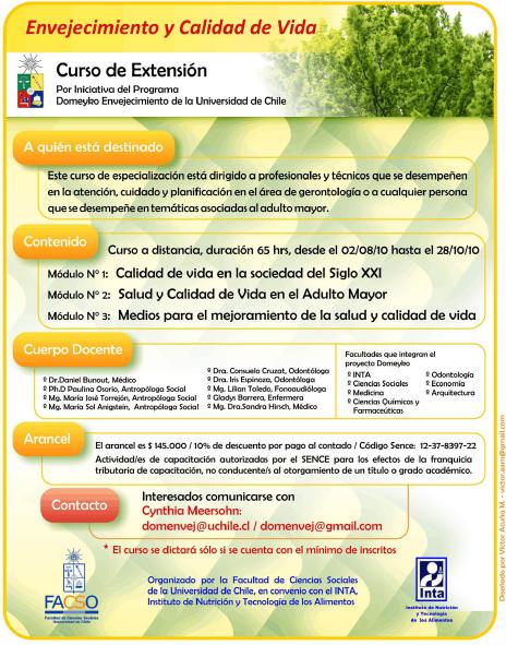 Curso a distancia, duración 65 hrs, desde el 02/08/2010 hasta el 28/10/2010. Organizado por la Facultad de Ciencias Sociales de la Universidad de Chile, en convenio con el INTA, Instituto de Nutrición y Tecnología de los Alimentos.